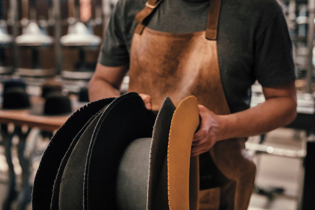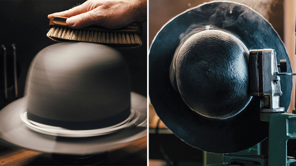 The hat body is lined up on a rack and left to rest for a few days in a climate-controlled room before going to surface finishing. Most are finished smooth, the felt shaved with fine abrasive papers, as well as conditioned and polished. Finally, a high-suction machine vacuums any dust particles from the pores of the hat. “A lot of the time you don’t see the problems until you begin surface finishing, because they’re beneath the outer layer of felt that’s being worked,” explains Thompson. “Those can be clumps of fibers that weren’t uniformly felted or color inconsistencies.” Finding such flaws means the hat must be scrapped.