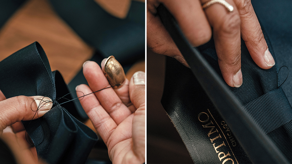 The piece is returned to the trimming room, where a satin lining is sewn inside the crown and a ribbon and bow are secured to the outside. “Most of our ribbon, we have specially produced for us,” Thompson says. “We’re fortunate enough to have a lot of vintage ribbon that was made in the 1930s, ’40s, and ’50s—the quality was more refined then.”